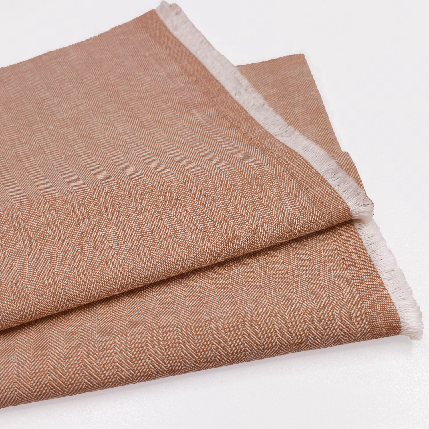 Dette fiskebensstoffet er den perfekte blandingen som gir pusteevne, mykhet og holdbarhet. Den er vevd slik at det tilfører en raffinert tekstur, noe som gjør det til et ideelt valg klær, mapper, vesker, nett, duker etc. Blandingen mellom bomull og lin gjør at det krøller mindre og er slitesterkt.