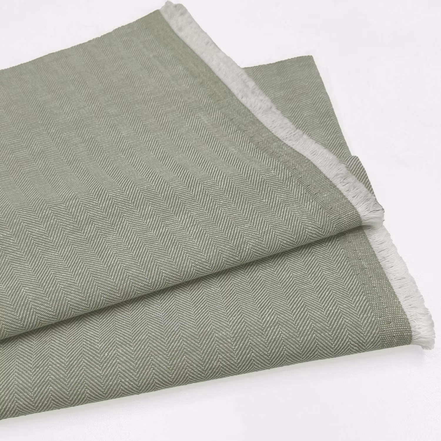 Dette fiskebensstoffet er den perfekte blandingen som gir pusteevne, mykhet og holdbarhet. Den er vevd slik at det tilfører en raffinert tekstur, noe som gjør det til et ideelt valg klær, mapper, vesker, nett, duker etc. Blandingen mellom bomull og lin gjør at det krøller mindre og er slitesterkt.