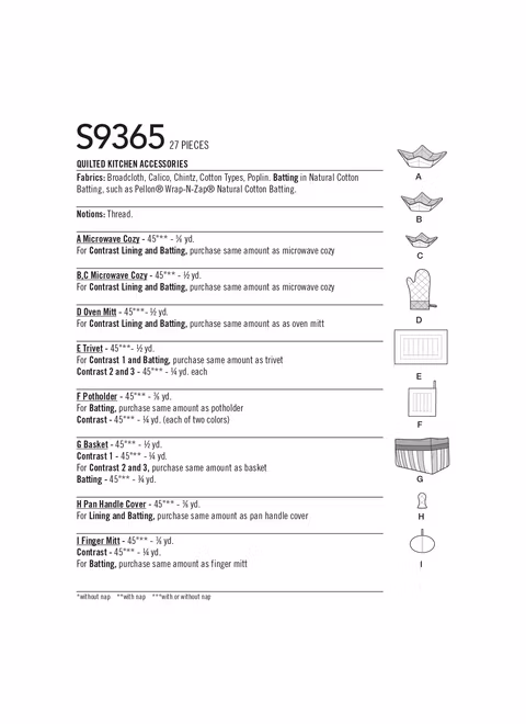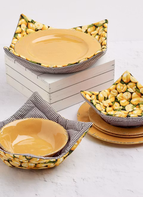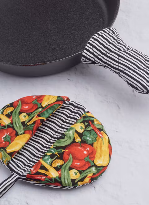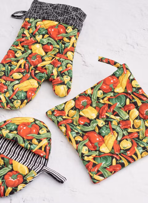 Insulated microwave cozies in three sizes protect hands from heated bowls. Oven mitt has cuff, hanging loop and diamond quilting. Pieced pot holder, trivet and bread basket are padded and simply quilted, great for fat quarters. Cast iron skillets are easy to handle with slip-on quilted handle cover. Finger mitt has two pockets for thumb and fingers with convenient hanging loop.© 2025 Lille Lambus Stoff & Tekstil