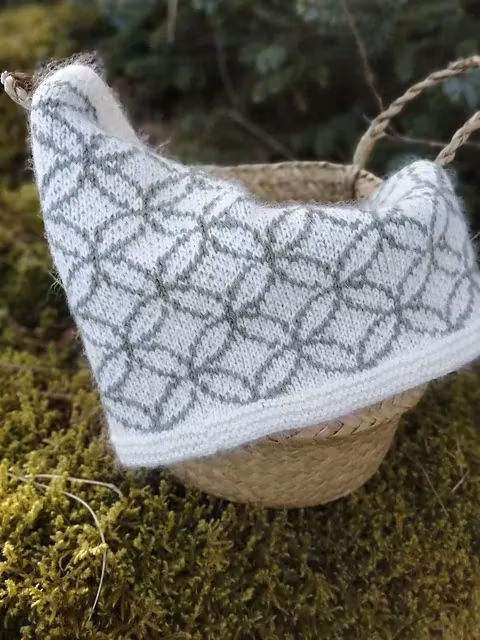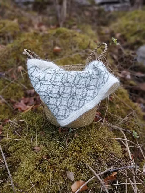 Strikkefasthet: 25 masker på pinne størrelse nummer 3,5mm med mønsterstrikk.