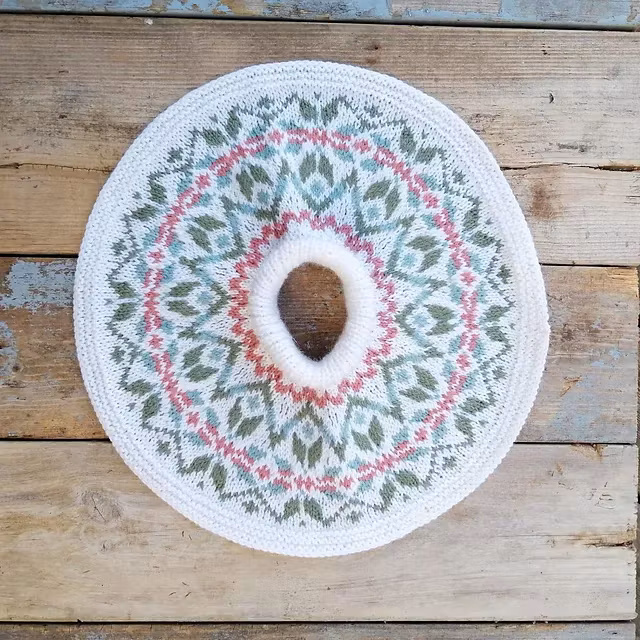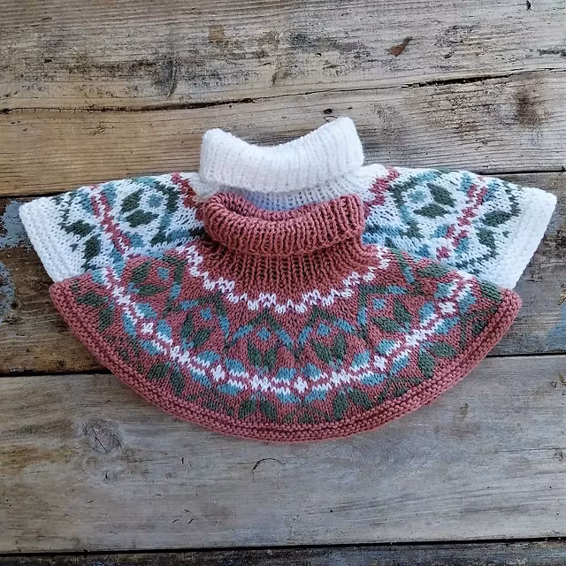 Plagget strikkes ovenfra og ned. Til denne halsen trenger du 4 farger. 1 Bunnfarge og 3 mønsterfarger. Bruker du en annen tråd, husk å sjekke hvor mange meter det er i garn nøstet.