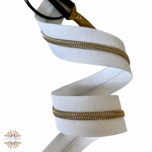 Nylon glidelås tape er ideell for vesker. I motsetning til metallglidelåser er nylontenner enkle å sy over uten å knekke nåler. Denne glidelåstapen har tenner i "metalllook", noe som gir den et mer luksuriøst utseende.
